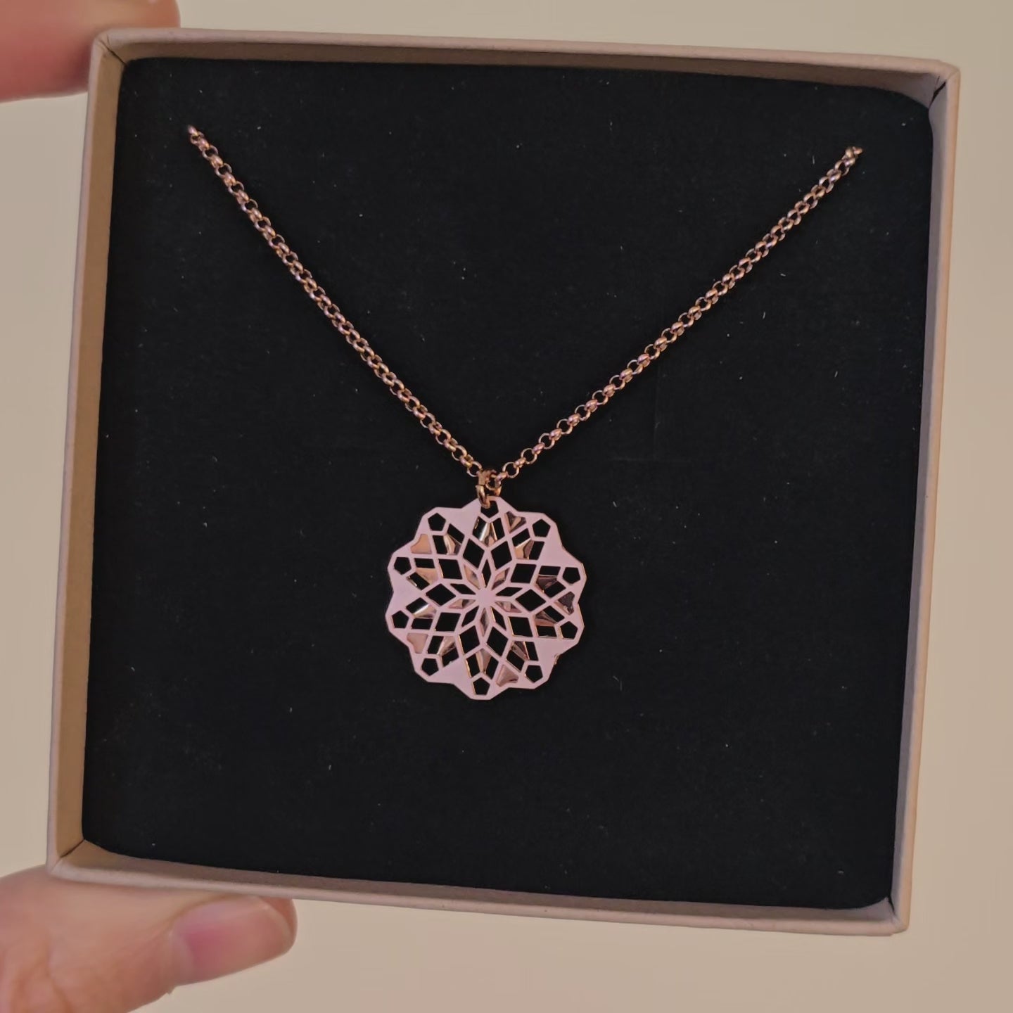 Die rosévergoldete „Floretta“-Kette vereint feminine Eleganz mit kunstvoller Raffinesse. Der filigrane Anhänger besteht aus zwei übereinander liegenden Scheiben, deren feines Muster durch das Zusammenspiel von glänzender und matter Oberfläche eine wunderschöne Tiefe erhält. Der warme Roséton verleiht dem Schmuckstück eine sanfte, moderne Ausstrahlung – perfekt für alle, die zarte Eleganz lieben.