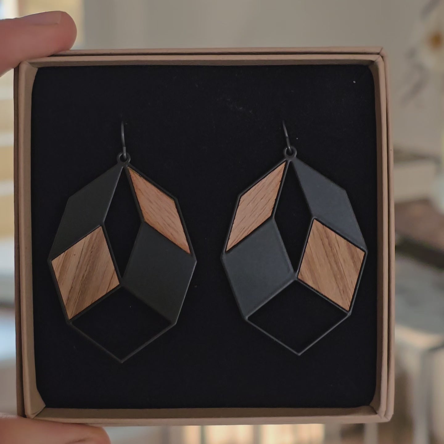 Diese großen Ohrringe in schwarzer Ausführung setzen mit ihrer dunklen Farbgebung einen starken Kontrast zu den warmen Holztönen der Intarsien. Ihr geometrisches Design macht sie zu einem stilvollen Highlight. Trotz ihrer Größe sind sie leicht und angenehm zu tragen und eignen sich perfekt für den Alltag oder besondere Anlässe.