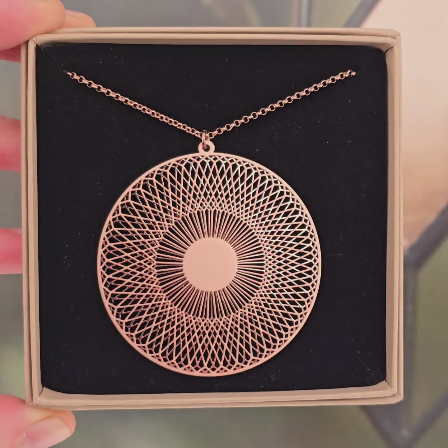 Die rosévergoldete „Sonnenrad“ Kette verbindet feminine Eleganz mit filigraner Raffinesse. Die Kombination aus matter und glänzender Fläche sorgt für faszinierende Lichtreflexe und macht diesen Anhänger zu einem stilvollen Highlight.