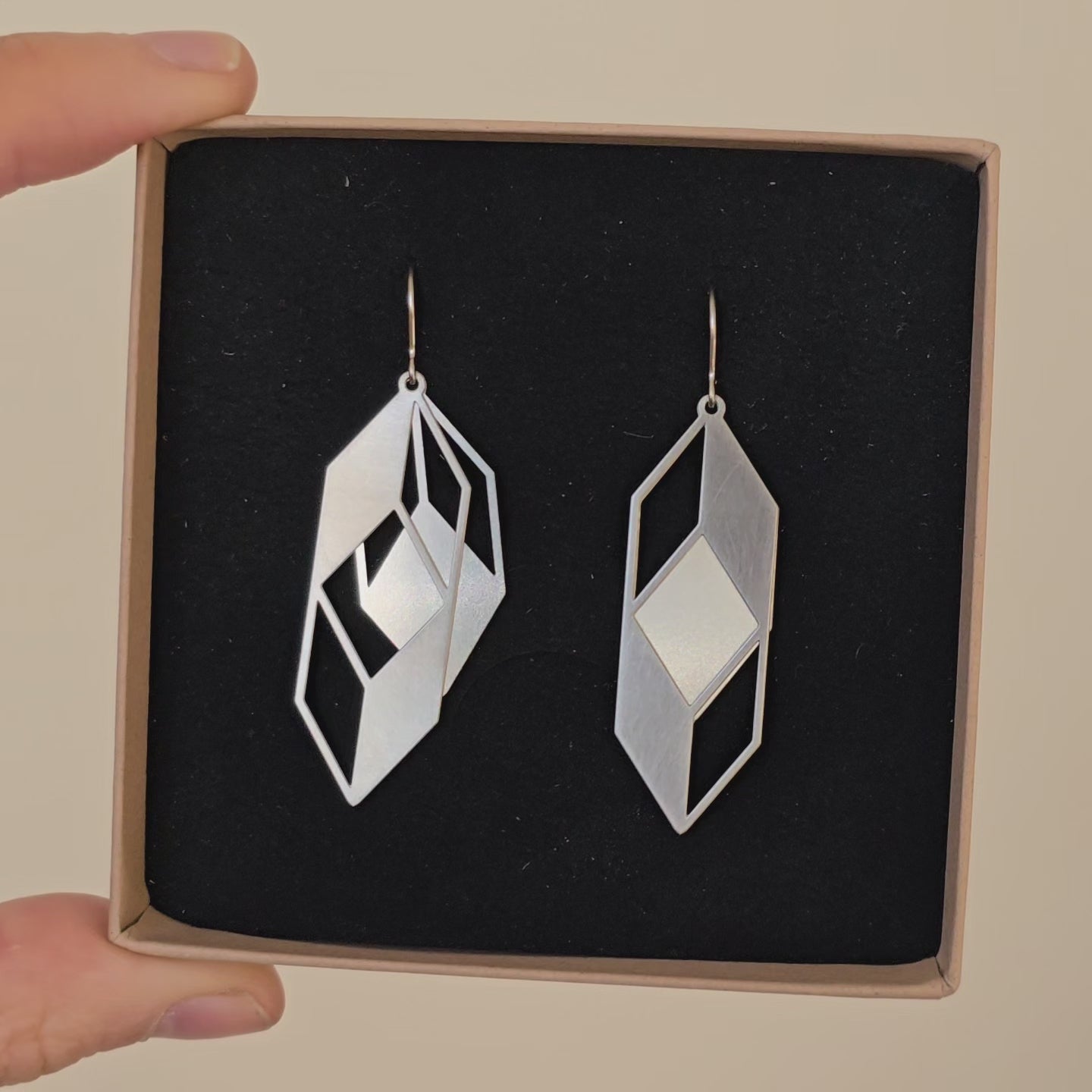 Die „Optical Illusion“ Ohrhänger in Edelstahl sind ein beeindruckendes Spiel aus Licht und Bewegung. Ihr raffiniertes Design kombiniert matte und glänzende Flächen, die durch ihre schwingende Bewegung bei jeder Bewegung neue Reflexe erzeugen. Das dreidimensionale geometrische Muster macht sie zu einem ästhetischen Highlight – ausgezeichnet mit dem German Design Award 2023.
